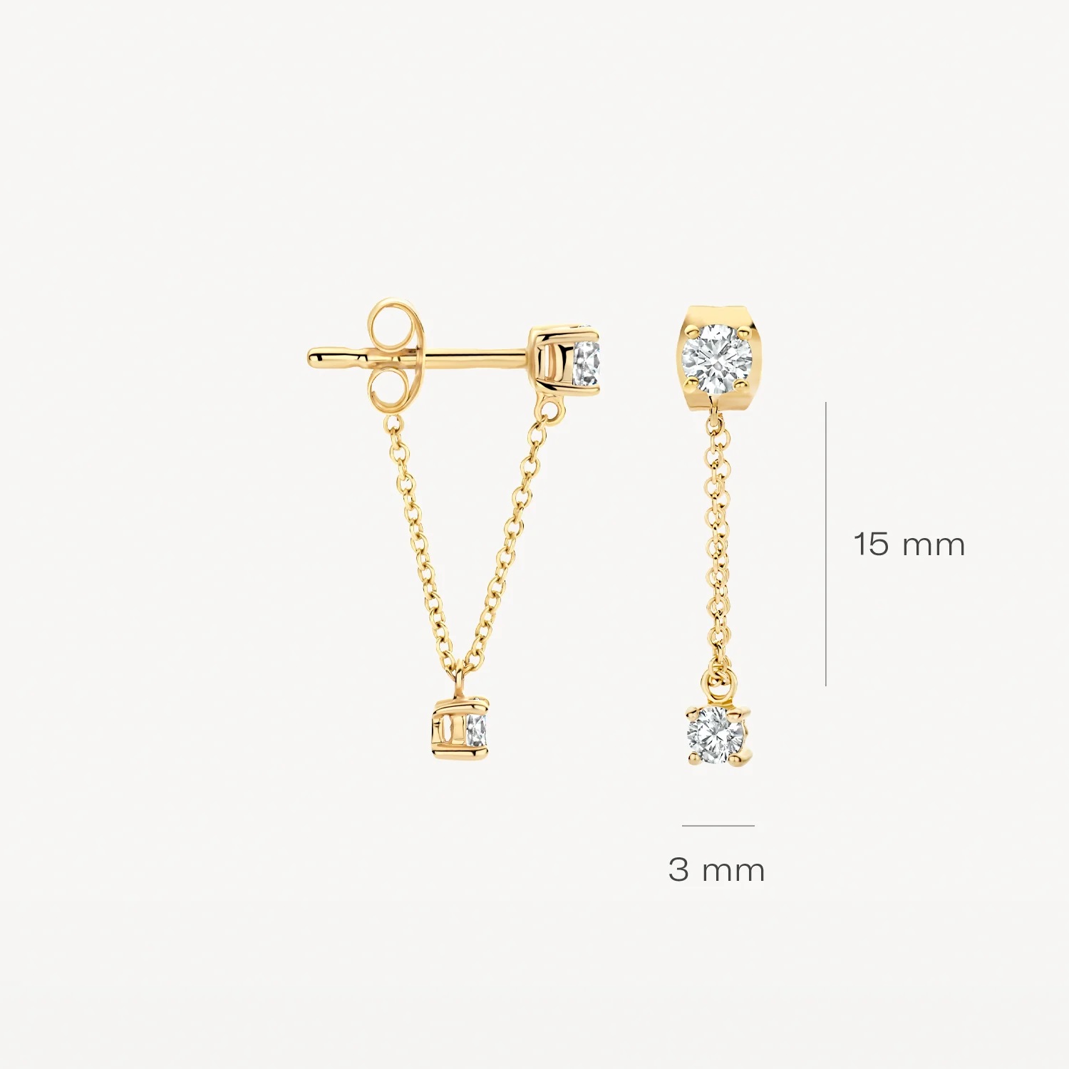 Blush - Geelgouden oorstekers met zirconia en kettinkje, 3x15mm - 7346YZI