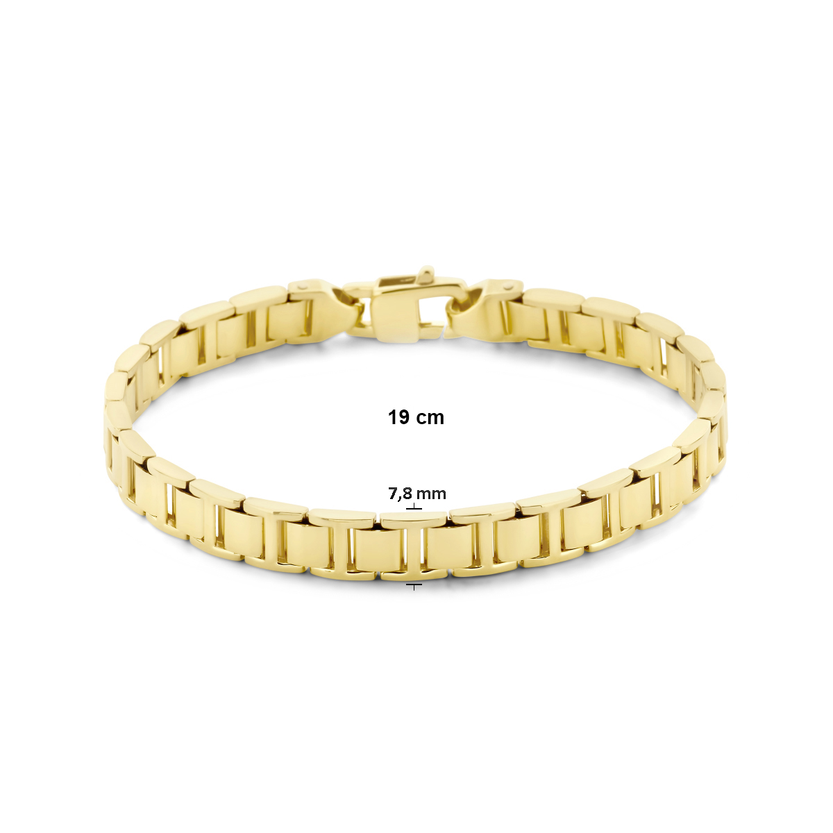 14k Geelgouden armband met een schakelbreedte van 7.8mm. De armband is uitgevoerd met een karabijn sluiting.