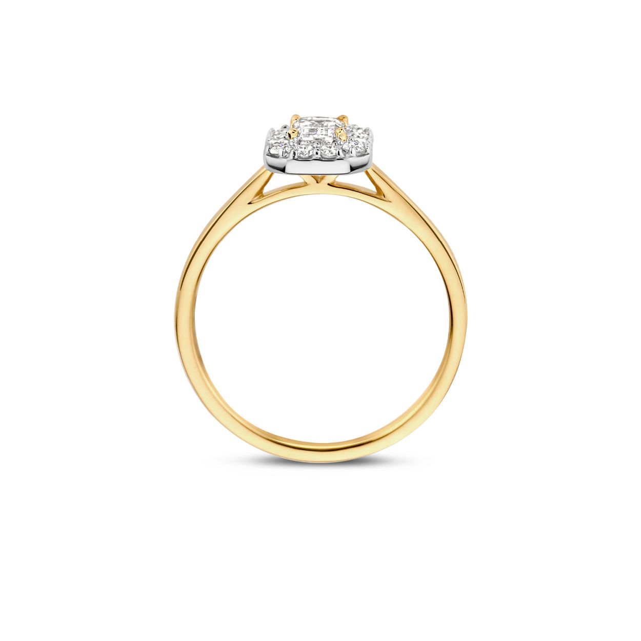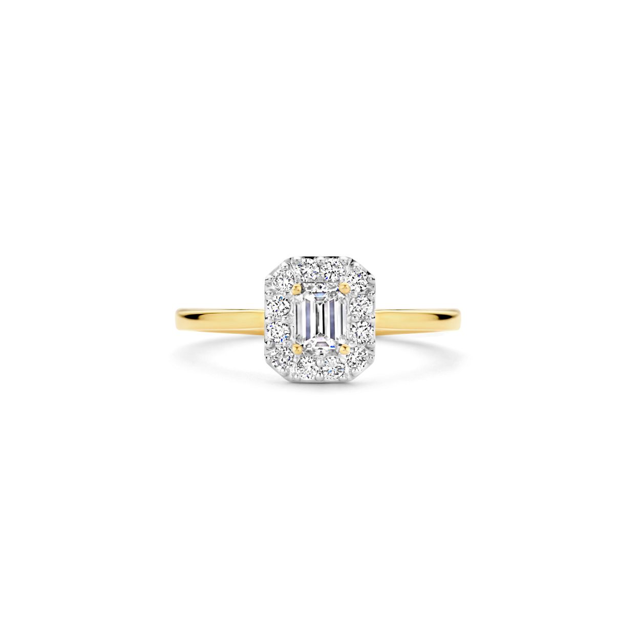 Blush Lab Diamonds - 14kt geelgouden entourage ring bezet met 0.40ct emerald slijpsel lab diamant en daaromheen 12 briljant geslepen lab diamanten 0.24ct - LG1011Y/56