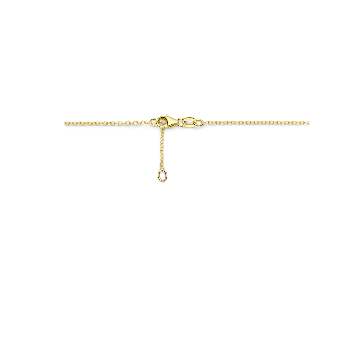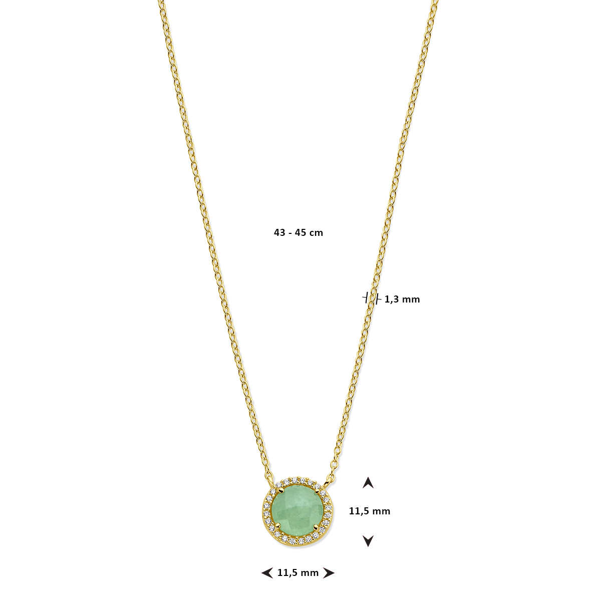 14k Geelgouden collier uitgevoerd met groen agaat en zirkonia. Het collier heeft draaglengtes van 43 en 45cm. De hanger heeft een diameter van 11.5mm. De schakelbreedte is 1.3mm. Uitgevoerd met een karabijn sluiting.