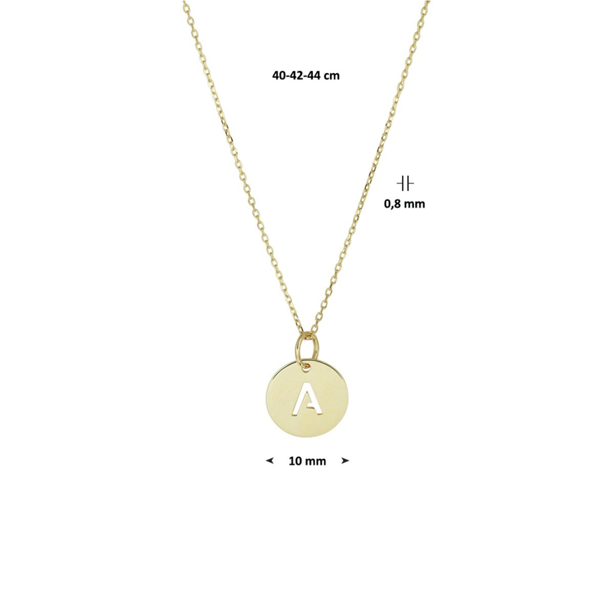 14k Geelgouden anker collier uitgevoerd met een ronde letter A hanger. De hanger heeft een diameter van 10 mm en het collier heeft draaglengtes van 40 42 en 44cm. Tip: Geef dit betekenisvolle collier cadeau aan een speciaal persoon.
