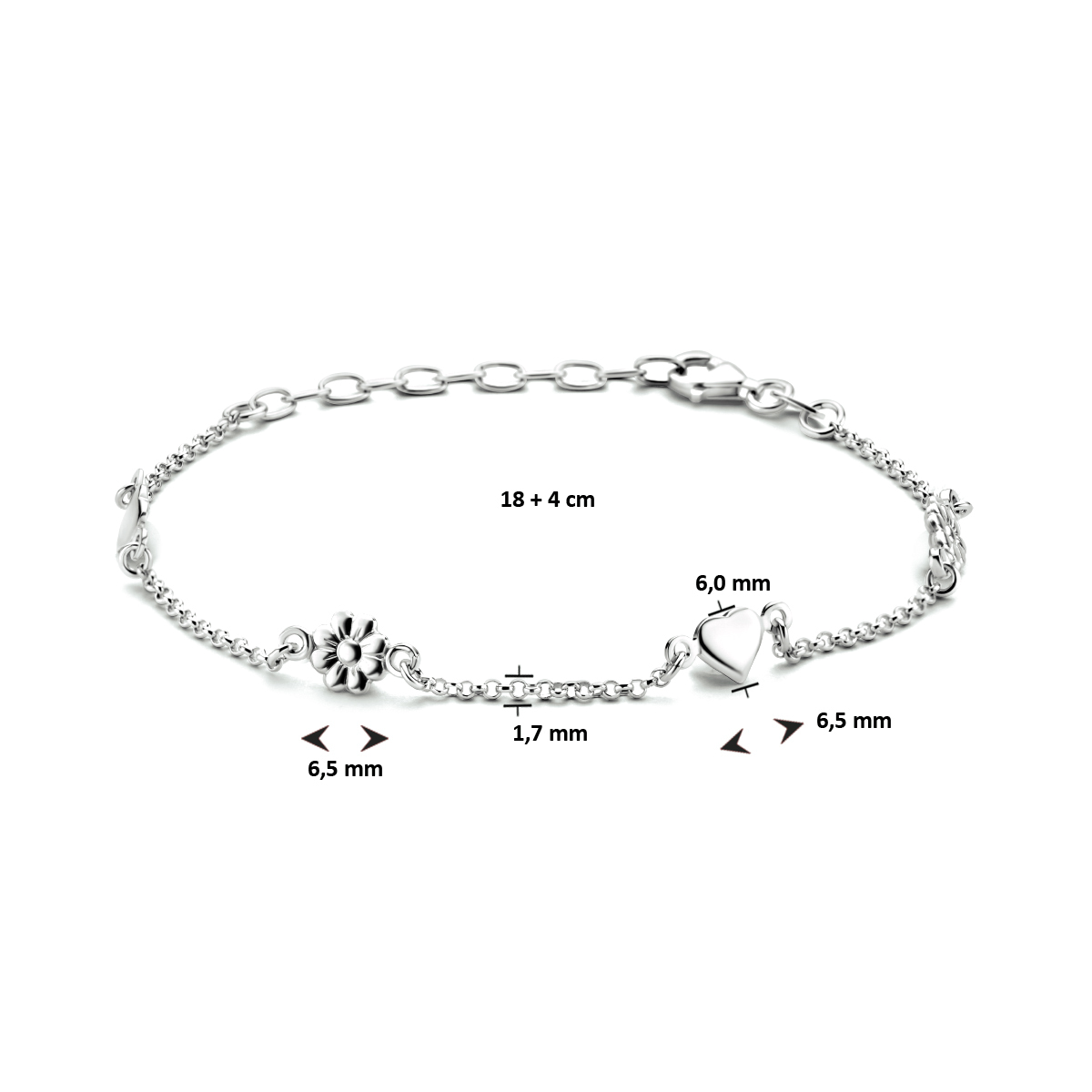 Gerhodineerd 925 zilveren enkelbandje uitgevoerd met een hartje en een bloemetje. Het enkelbandje heeft een draaglengte van 18cm met een extensie van 4cm en een stevige karabijn sluiting. De schakelbreedte is 1.7mm.