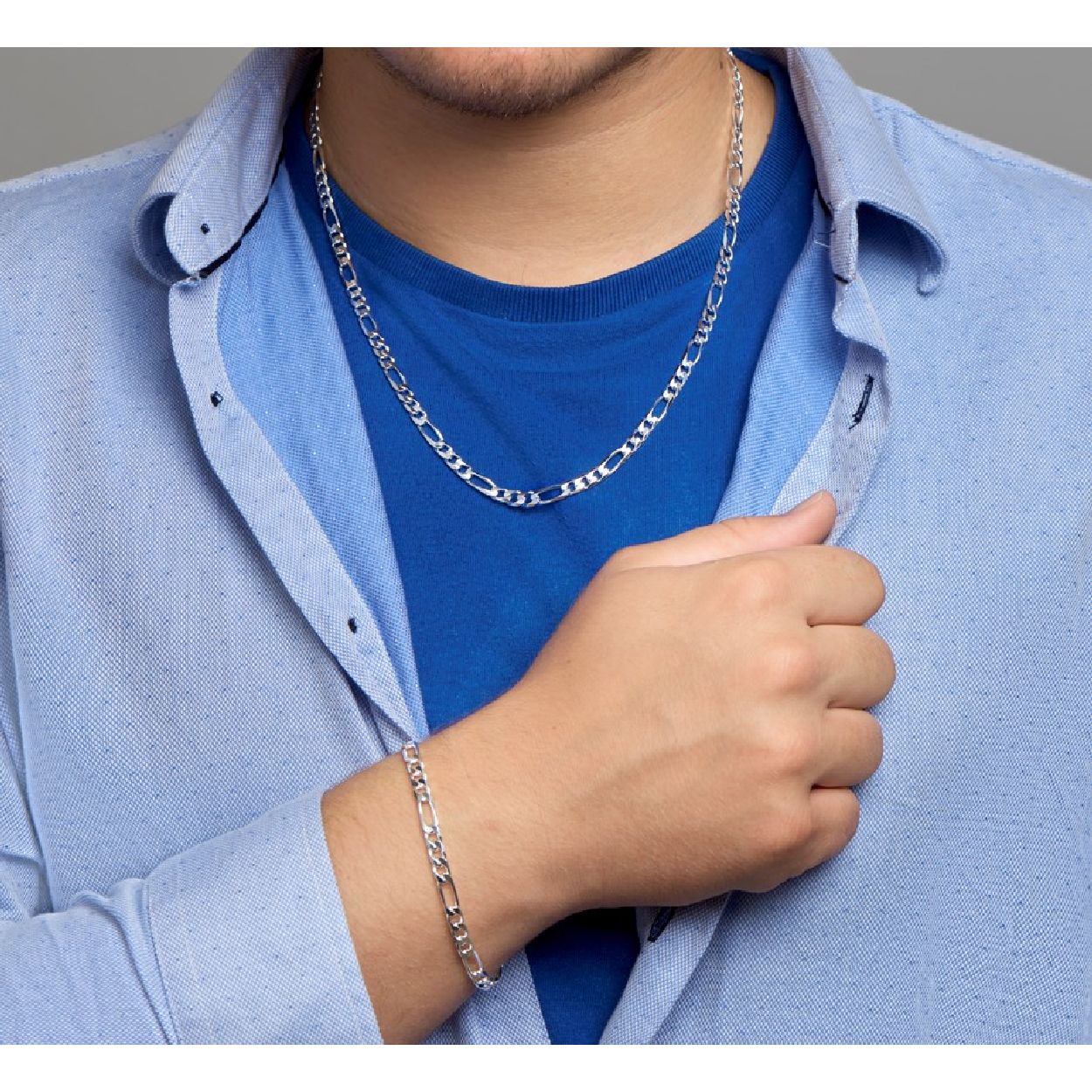 De armband is gemaakt van zilver en is zilverkleurig. Het is een sieraad voor heren.
