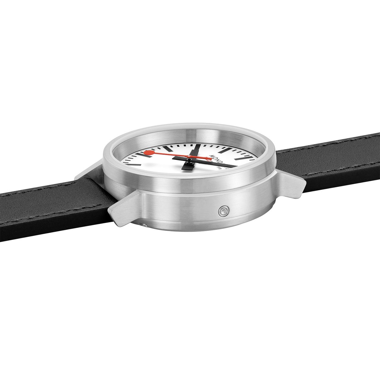 Dit design horloge uit de Mondaine Stop2Go serie heeft een vegan lederen horlogeband. Het horloge heeft vlak krasvast saffierglas en een strakke ronde matte horlogekast met een kastdiameter van 41mm en een witte wijzerplaat.