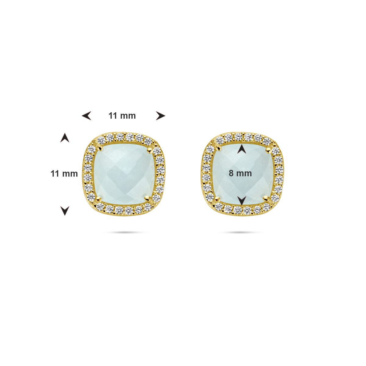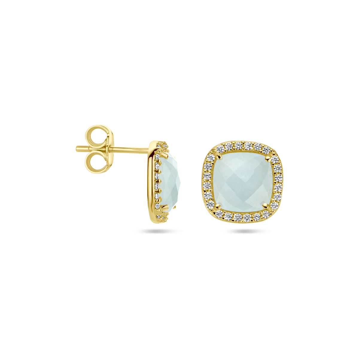 14k Geelgouden oorknoppen uitgevoerd met aquamarijn en zirconia. De oorknoppen hebben een afmeting van 11 x 11mm.