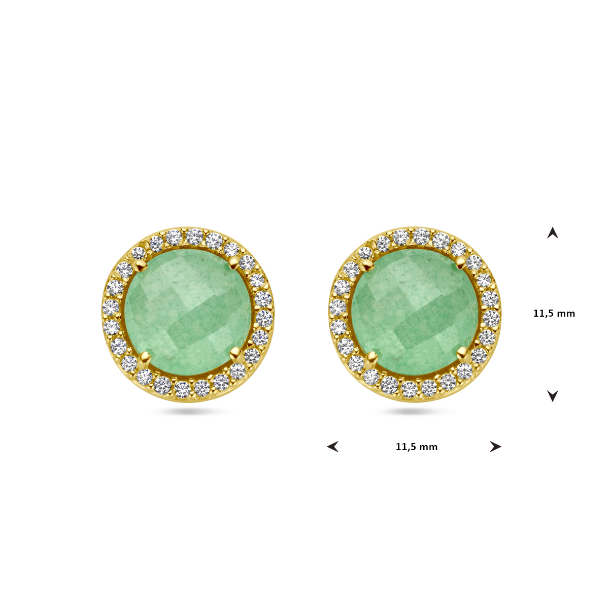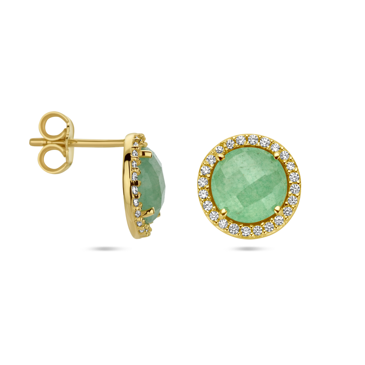 14k Geelgouden oorknoppen uitgevoerd met groen agaat en zirkonia. De oorknoppen hebben een diameter van 11,5mm