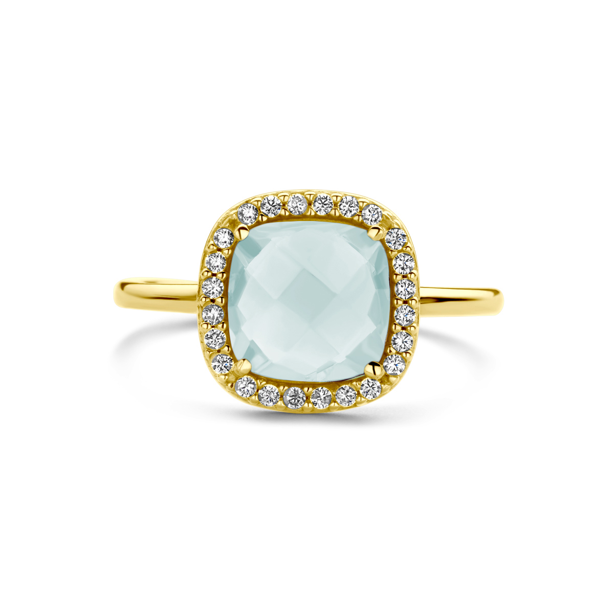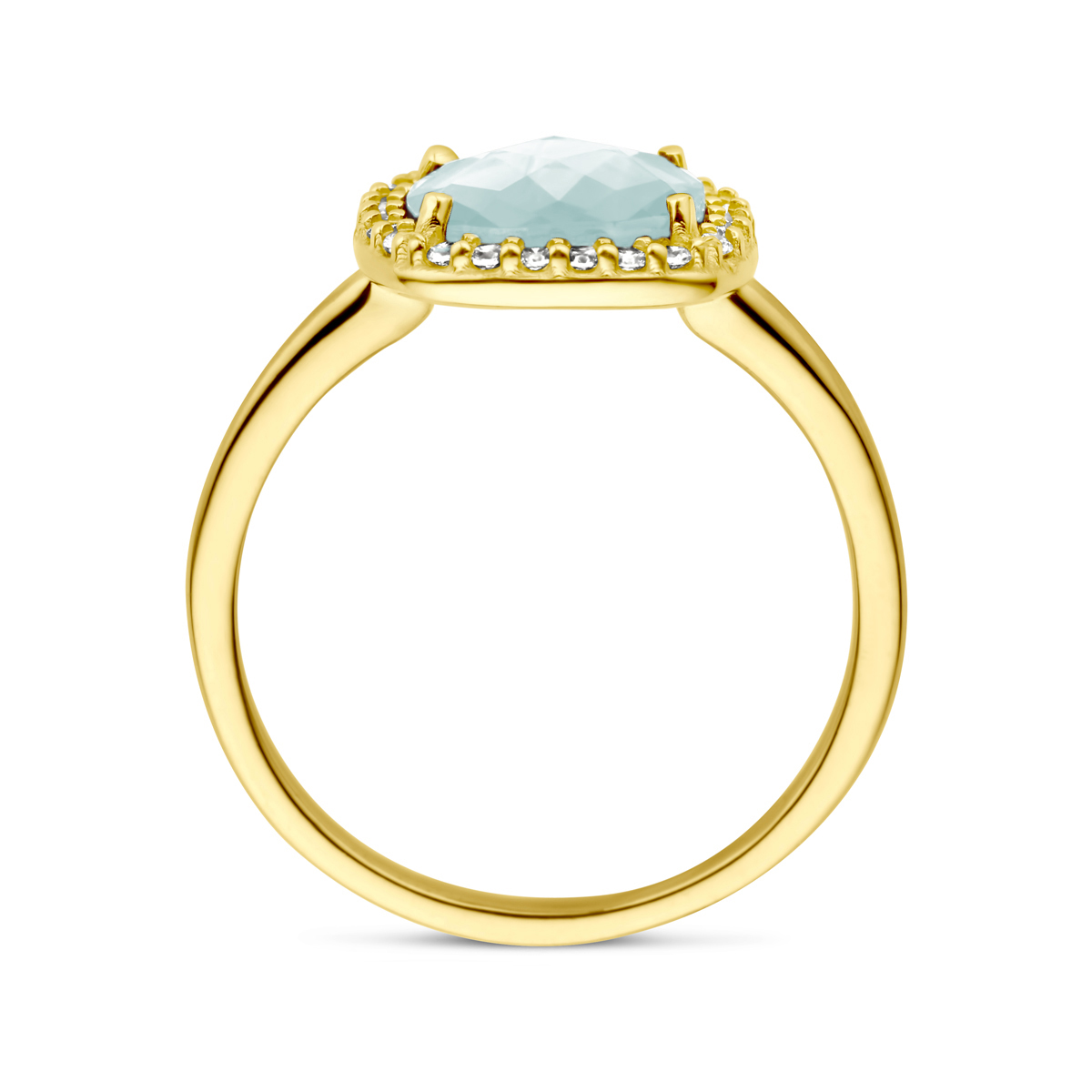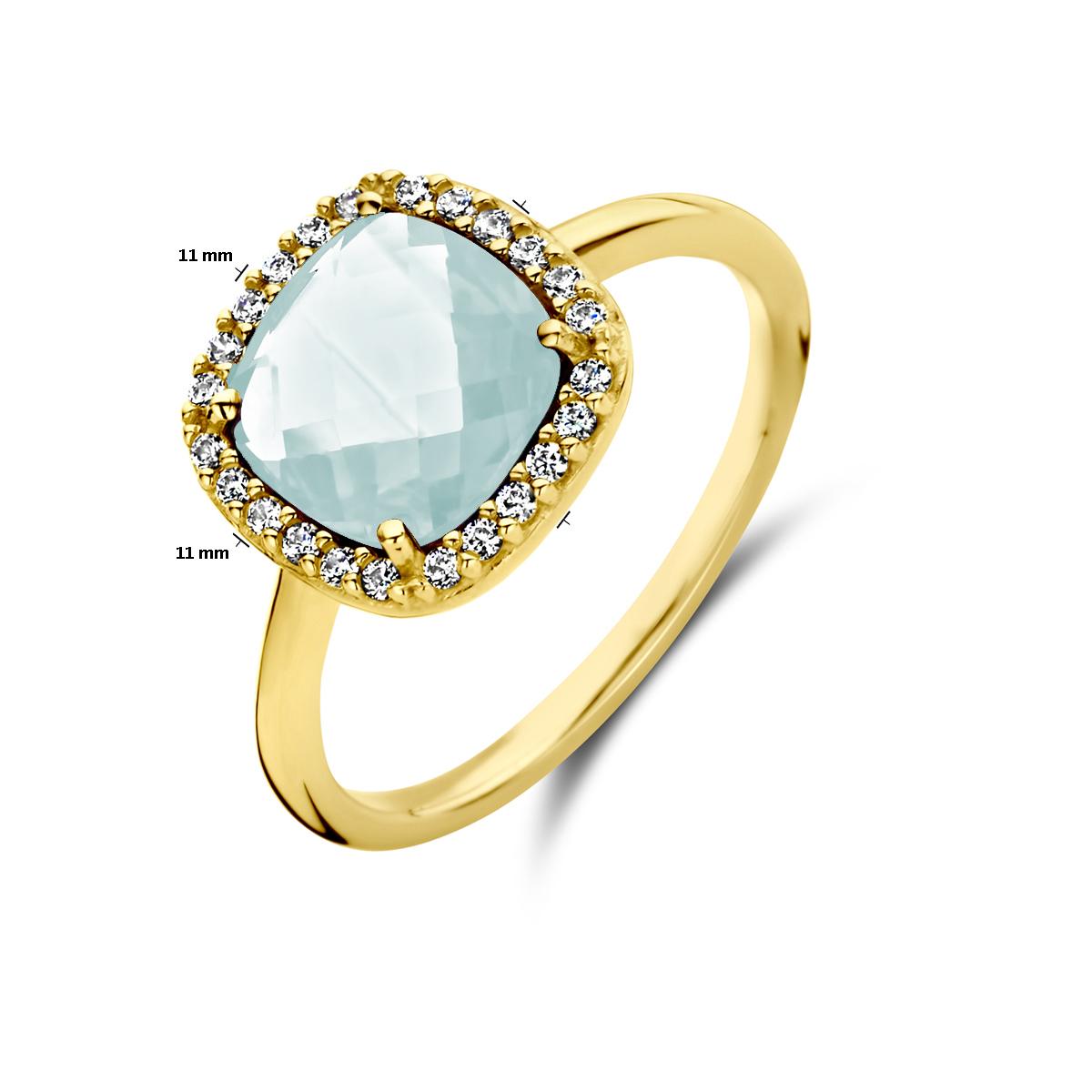 14k Geelgouden ring uitgevoerd met aquamarijn 8mm en zirconia. De ring heeft een breedte van 11mm.