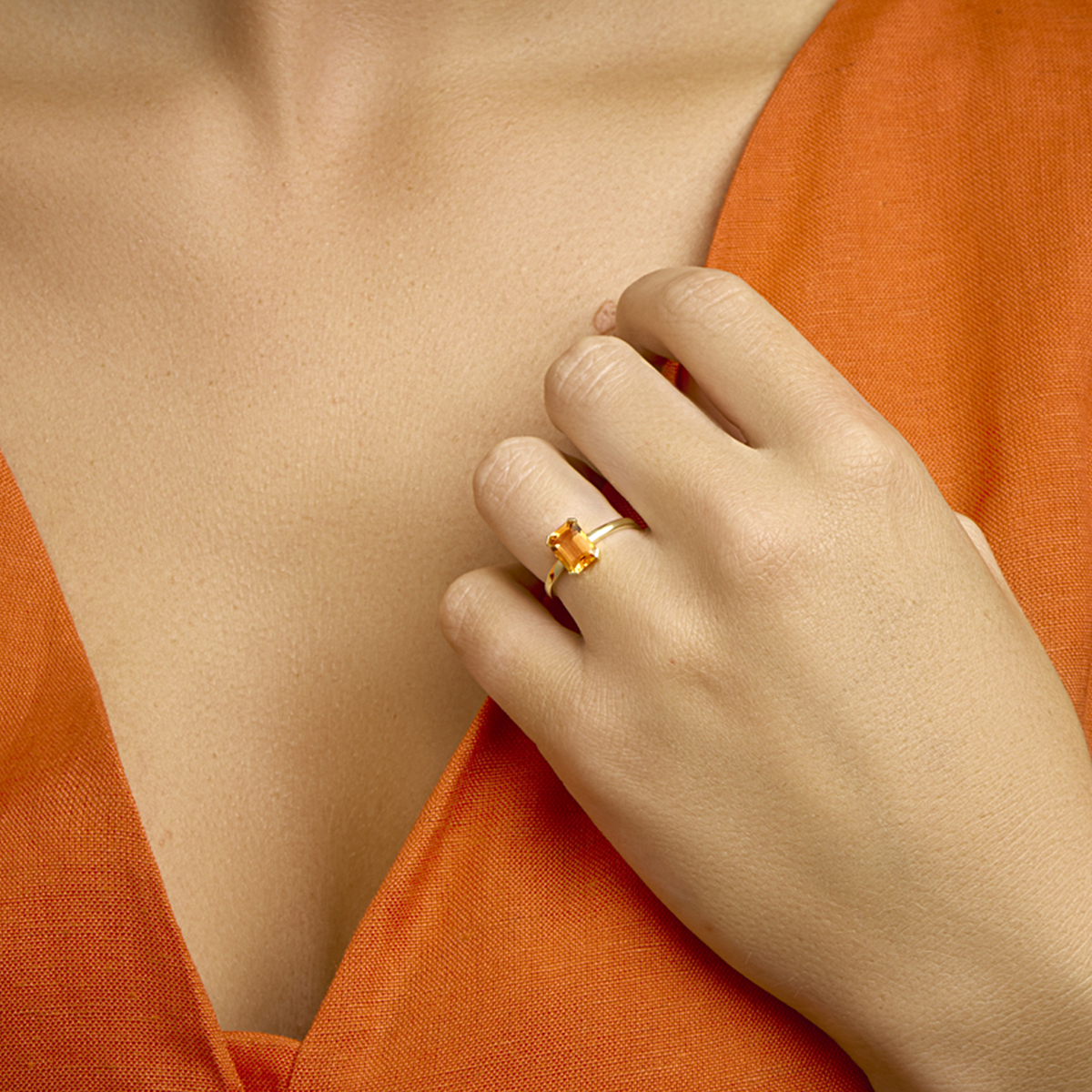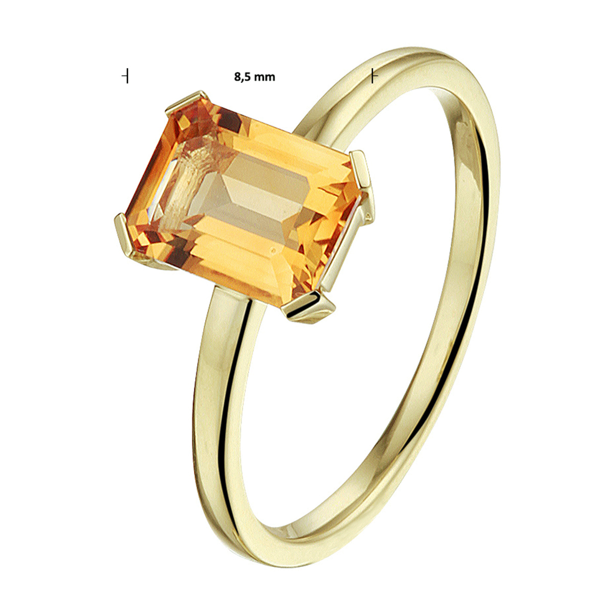 14k Geelgouden ring uitgevoerd met een schiterende citrien. De ring heeft een breedte van 8,5mm. De citrien heeft een afmeting van 8x6mm.