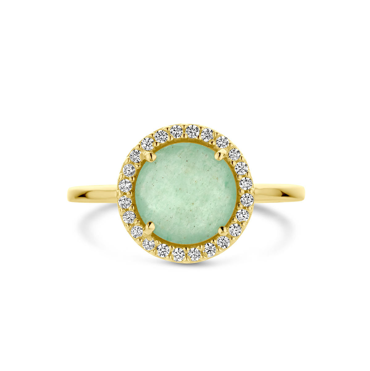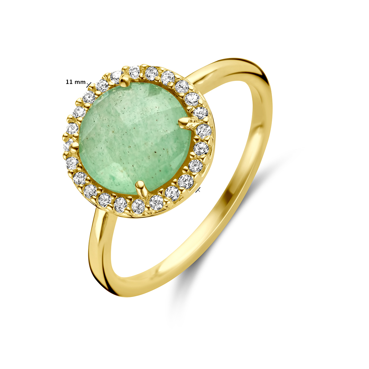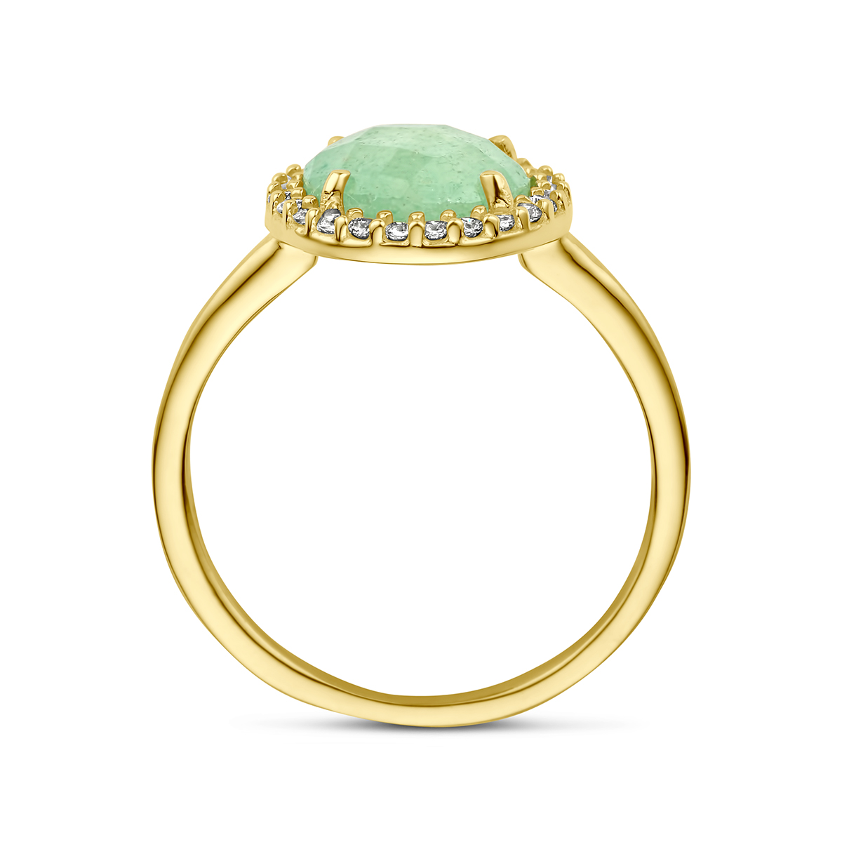 14k Geelgouden ring uitgevoerd met groen agaat en zirkonia. De ring heeft een breedte van 11mm.