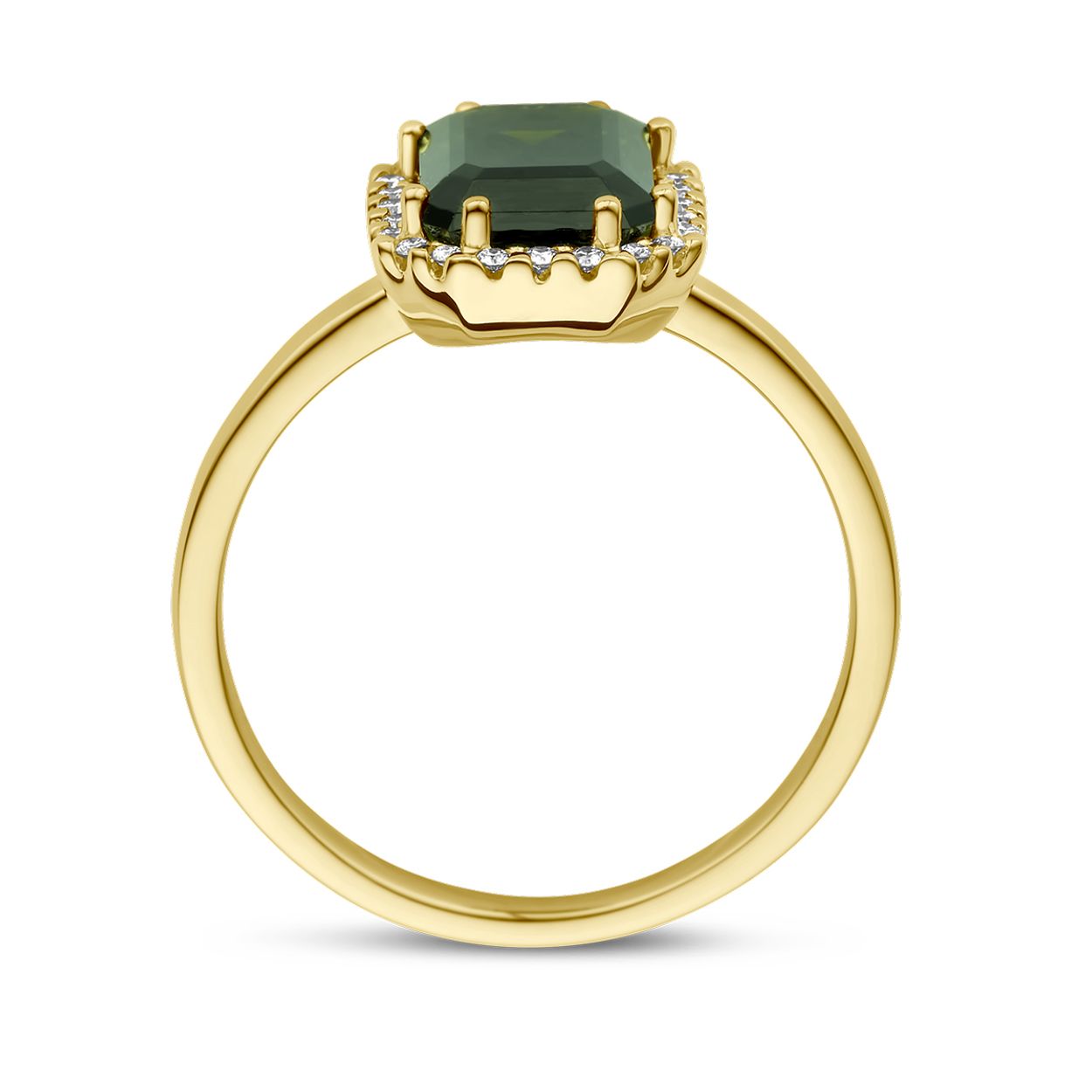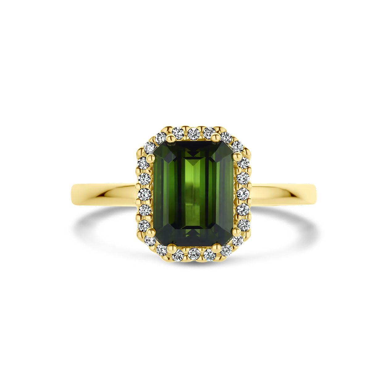 14k Geelgouden ring uitgevoerd met toermalijn 8x6mm en diamant. De ring heeft een breedte van 10.5mm.