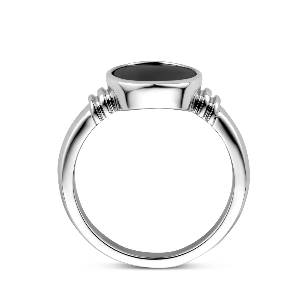 Stijlvolle gerhodineerd zilveren ring met een onyx steen en een poli afwerking. Info: Gerhodineerd zilver is door de rhodiumlaag beter bestand tegen verkleuren en krassen.