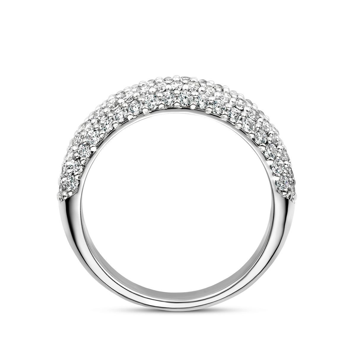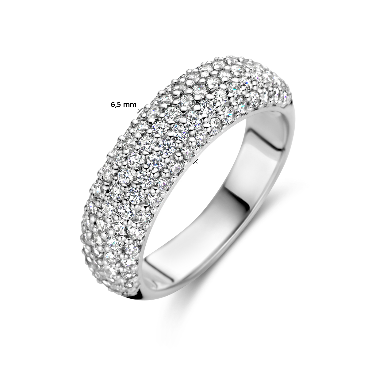 Gerhodineerd 925 zilveren ring uitgevoerd met zirkonia. De ring heeft een breedte van 6.5mm. Maat 18,5